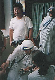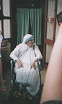 しばらく待った後、修道女におされた車椅子に座ったマザーテレサが現れ、カメラをかまえていた人々の シャッターが一斉に降りる。マザーテレサはひとり一人、名刺とメダルを手渡し、握手、そしてお話をして くださる。
